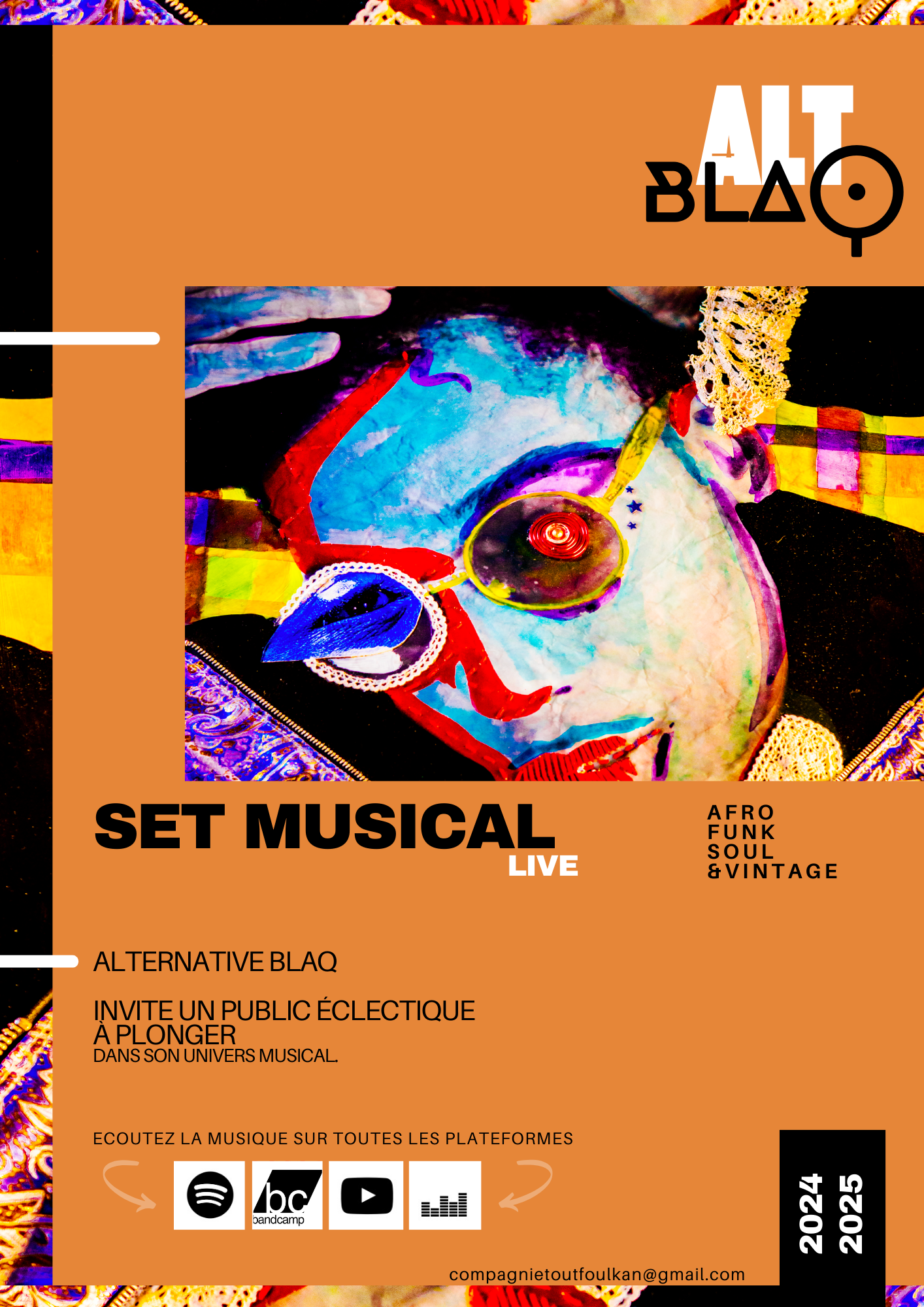 Un set musical varié mêlant plusieurs styles Afro – funk -Soul – Vintage. C’est autour des créations musicales & sonores de l’artiste Alt BlaQ que le spectacle s’articule. Chansons et compositions originales seront mises à l’honneur au travers des langues créoles, française et anglaise. Certaines reprises inédites d’artistes influents s’invitent dans ce voyage : Ben E.King, Bobby Caldwell, Silo, Bill Withers, Stromae …